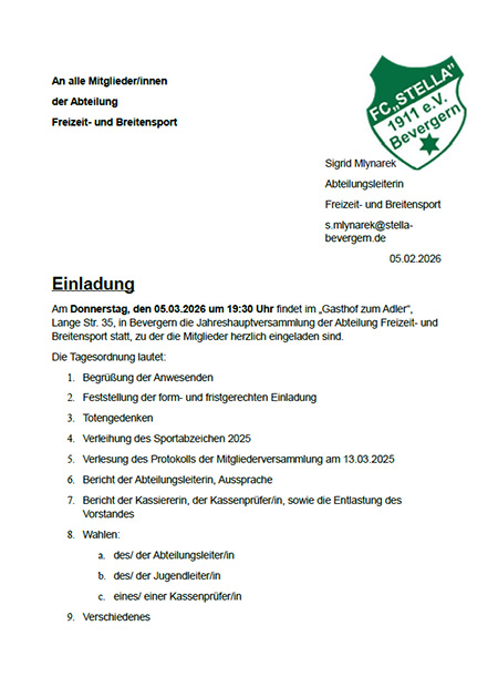 Am Donnerstag, den 05.03.2026 um 19:30 Uhr findet im „Gasthof zum Adler“, Lange Str. 35, in Bevergern die Jahreshauptversammlung der Abteilung Freizeit- und Breitensport statt, zu der die Mitglieder herzlich eingeladen sind.
